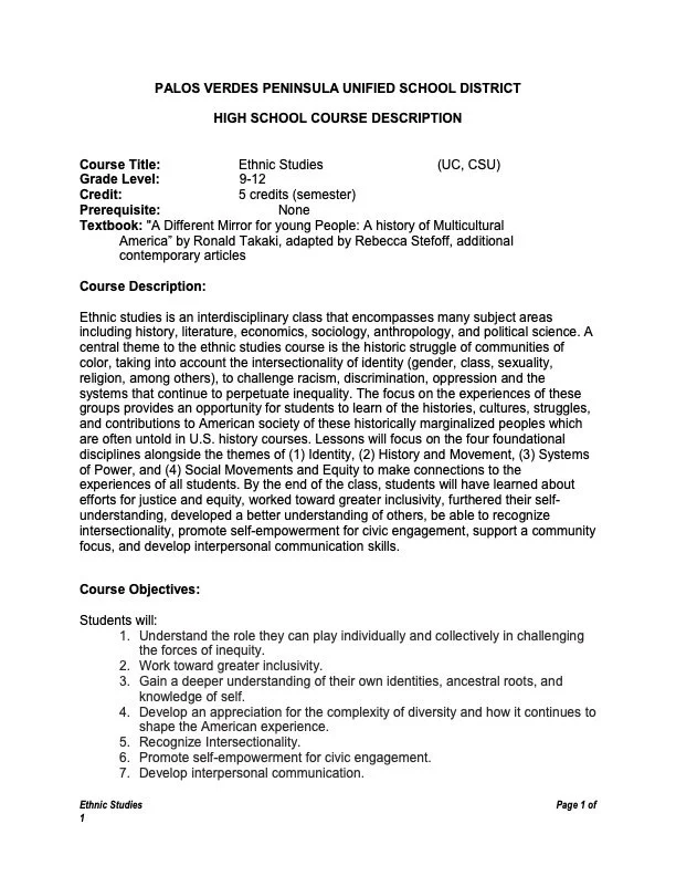 An Ethnic Studies class was offered to PVPUSD high school students in the fall of 2021. The district enlisted a few teachers to design a curriculum and pilot the class. Although the class has been taught to students and the full curriculum should be available upon request from parents per the CA Education Code 49091.10, it has not been made available to the parents. The Palos Verdes Peninsula Unified School District has only provided a course outline.